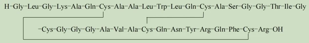 枯草三十七肽,英文名稱:Sublancin,由37個氨基酸殘基組成,化學(xué)名稱為L-甘氨酰-L-亮氨酰-L-甘氨酰-L-賴氨酰-L-丙氨酰-L-α-谷氨酰-L-半胱氨酰-L-丙氨酰-L-丙氨酰-L-亮氨酰-L-色氨酰-L-亮氨酰-L-α-谷氨酰-L-半胱氨酰-L-丙氨酰-L-絲氨酰-L-甘氨酰-L-甘氨酰-L-蘇氨酰-L-異亮氨酰-L-甘氨酰-L-半胱氨酰-L-甘氨酰-L-甘氨酰-L-甘氨酰-L-丙氨酰-L-纈氨酰-L-丙氨酰-L-半胱氨酰-L-α-谷氨酰-L-α-天冬氨酰-L-酪氨酰-L-精氨酰-L-α-谷氨酰-L-苯丙氨酰-L-半胱氨酰-L-精氨酰胺,分子式為C162H254N50O51S5,分子量為3879.8Da,結(jié)構(gòu)式如圖1所示;二級結(jié)構(gòu)中α-螺旋為35.1%、β折疊為40.5%、無規(guī)卷曲為24.4%、不含β轉(zhuǎn)角;三級結(jié)構(gòu)含兩個二硫鍵連接兩個α-螺旋,形成緊密結(jié)構(gòu),見圖2。獨特的二三級結(jié)構(gòu)使枯草三十七肽性質(zhì)較為穩(wěn)定,抗逆性強,對高溫、酸、堿及胃蛋白酶和胰蛋白酶具有良好的抵抗力。