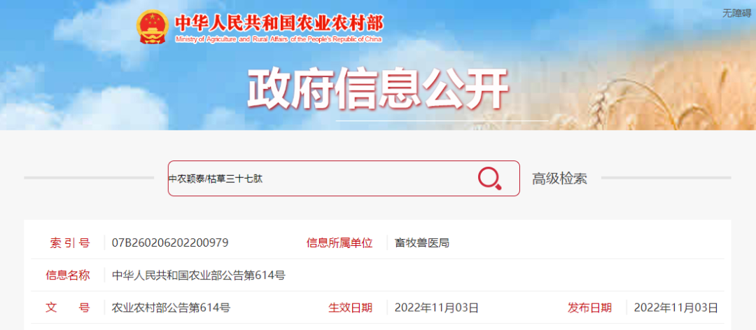 2022年11月3日,農(nóng)業(yè)農(nóng)村部公告第614號,批準(zhǔn)中農(nóng)穎泰林州生物科園有限公司申請的枯草三十七肽為新飼料添加劑,并準(zhǔn)許在中華人民共和國境內(nèi)生產(chǎn)、經(jīng)營和使用,核發(fā)飼料和飼料添加劑新產(chǎn)品證書,同時發(fā)布產(chǎn)品標(biāo)準(zhǔn)。