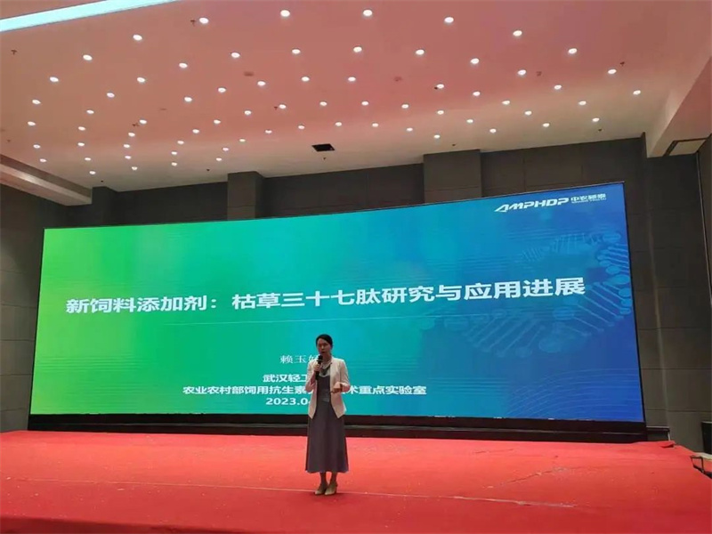 4月21日上午,武漢輕工大學賴玉嬌博士做《新飼料添加劑:枯草三十七肽研究與應用發展》主題分享報告。賴博士從“飼用替抗”產品的市場需求出發,談到了在眾多的替抗方案中,抗菌肽因其獨特的作用機制(破壞病原體膜結構的完整性)、不易產生耐藥性、綠色安全,被認為是抗生素的首選替抗品。2022年11月,中農穎泰自主研發的枯草三十七肽榮獲抗菌肽新飼添證書(證書號:新飼證字(2022)04號)。
