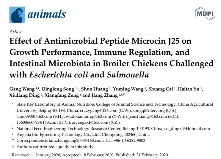 參考文獻:Wang G, Song Q, Huang S,et al. Effect of Antimicrobial Peptide Microcin J25 on Growth Performance, Immune Regulation, and Intestinal Microbiota in Broiler Chickens Challenged with Escherichia coli and Salmonella. Animals (Basel). 2020 Feb 21;10(2):345. doi: 10.3390/ani10020345.