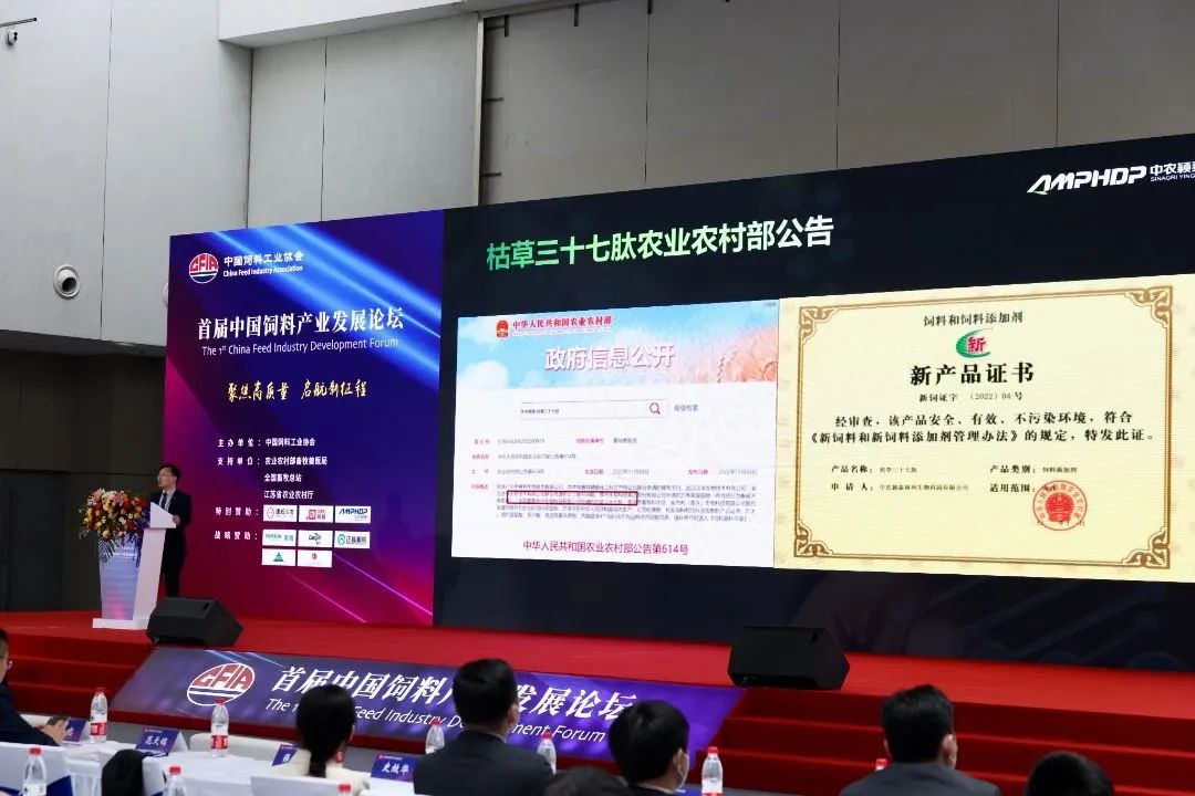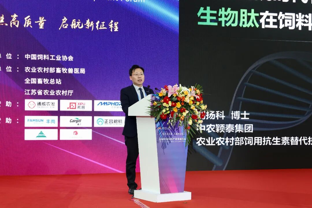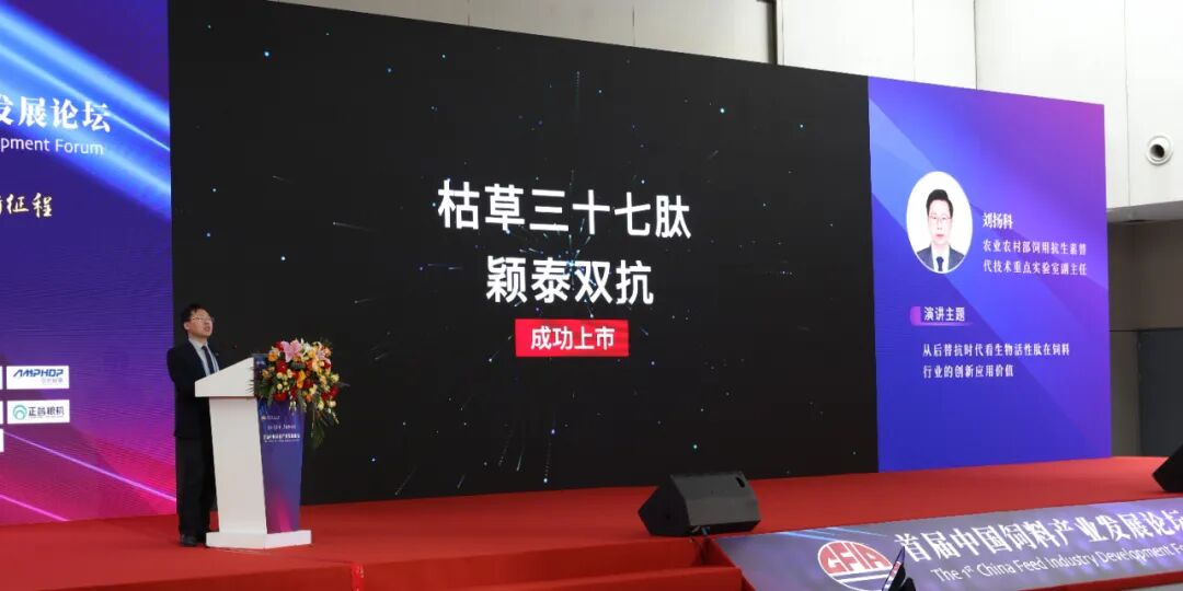 農業農村部飼用抗生素替代技術重點實驗室副主任——劉揚科博士出席會議,做題為“從后替抗時代看抗菌肽在飼料行業的創新應用價值”精彩報告,報告中劉揚科博士對抗菌肽的政策支持、研究歷程、產業化工藝、作用機理等做了系統闡述,重點介紹了中農穎泰集團的“枯草三十七肽”于2022年11月獲得國際首個抗菌肽新飼料添加劑證書,“枯草三十七肽”具有增強機體免疫功能,調節腸道菌群,改善腸黏膜形態結構等作用。并對集團新產品“枯草三十七肽——穎泰雙抗”成功上市表示熱烈祝賀!新產品抗菌肽批文合法合規、成分清晰可定量檢測,高效抑菌顯著降低腹瀉。